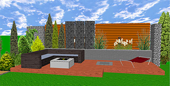Mit einer gestuften Steingabionenwand an der Seite wird ein harmonischer Übergang zum Bestandsgarten geschaffen.