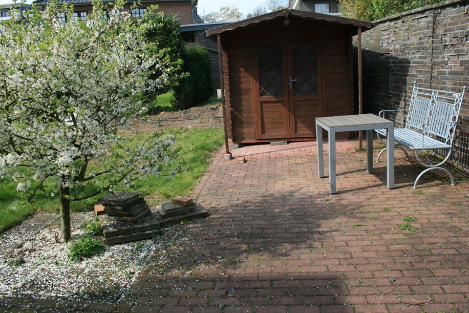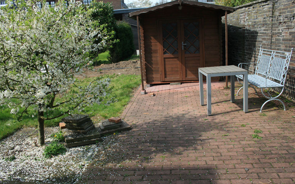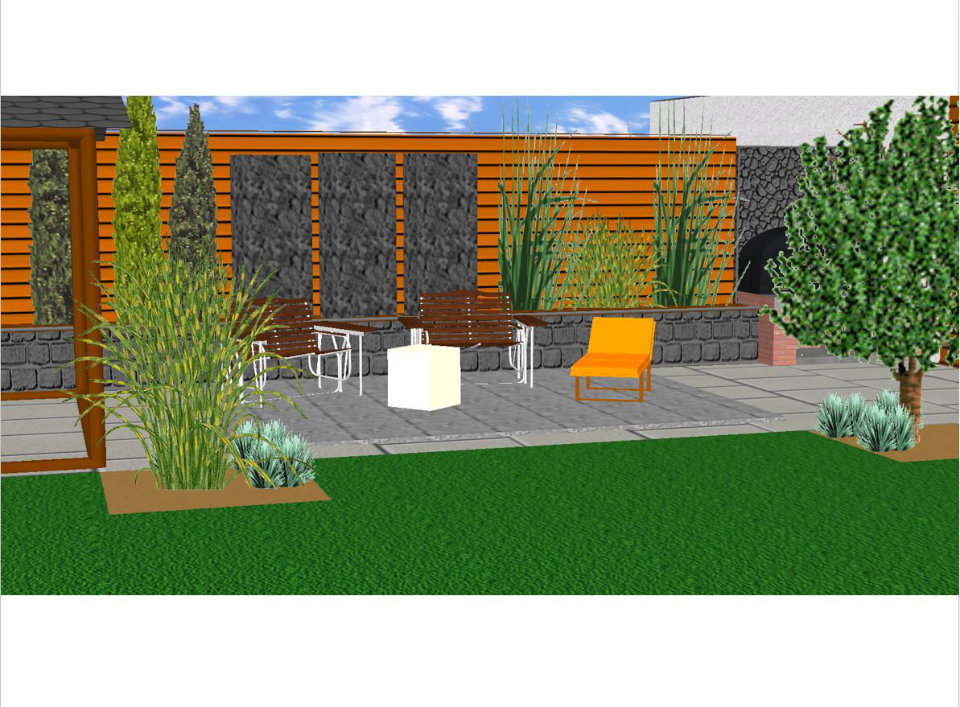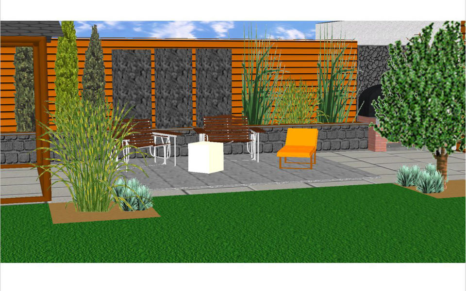 Im Hauptgarten soll vor dem Gartenhaus ein gemütlicher Loungsbereich entlang einer alten Mauer entstehen. Die Mauer wird mit einer neuen Holzwand mit Querlattung kaschiert. Davor bietet ein Hochbeet viele individuelle Gestaltungsmöglichkeiten. Pflanzen und Schieferstelen lockern die Optik auf und werfen im Schein der Bodenstrahler atmosphärische Schatten.