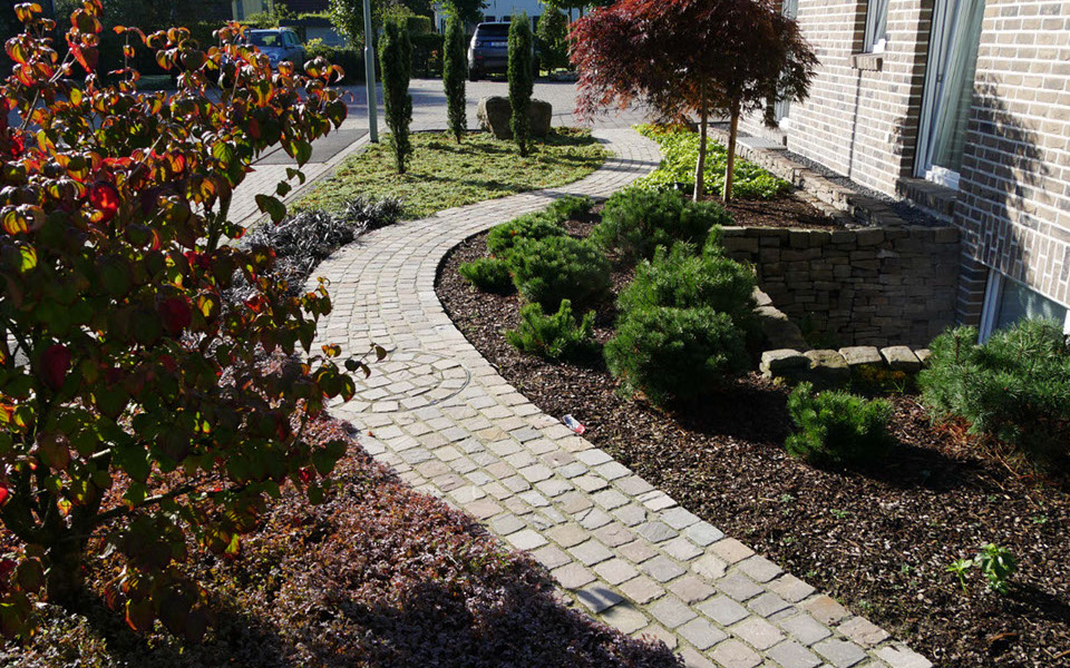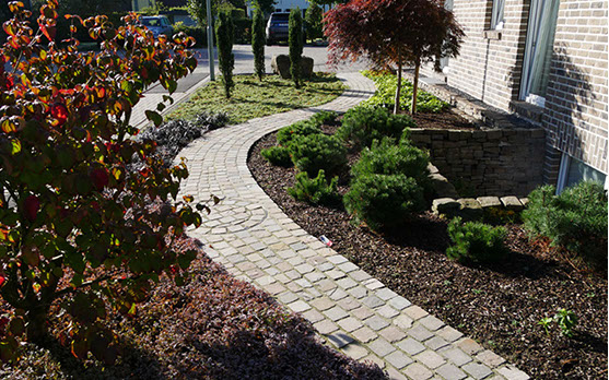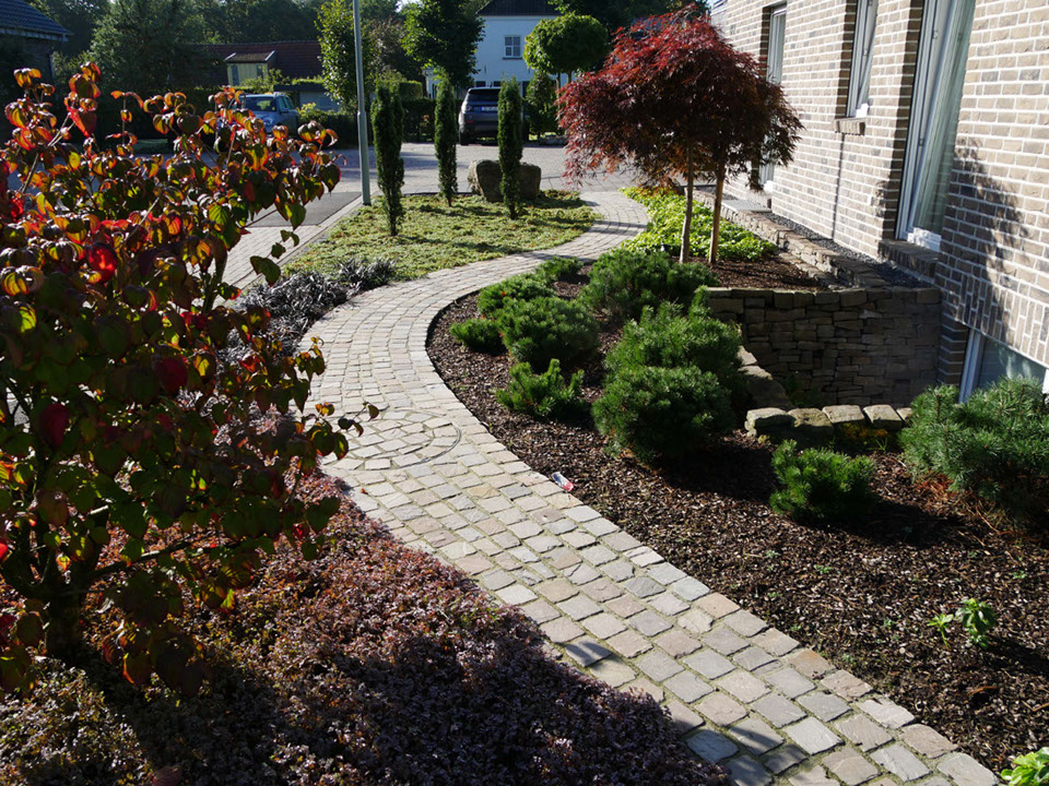 Obwohl der Hauseingang nicht durch den Vorgarten sondern seitlich über die Einfahrt erreichbar ist, hat der neue geschwungene Weg im Vorgarten seine Berechtigung. Er verbindet die Auffahrt mit dem Hauptgarten und macht den Vorgarten erlebbar. Dazu trägt auch der große Findling am linken Wegende bei, der eine spontane Sitzgelegenheit zum Verweilen bietet.