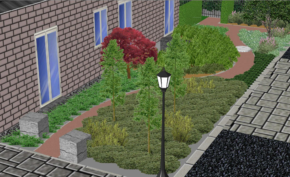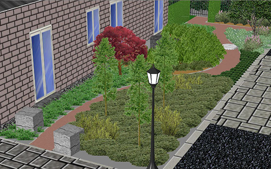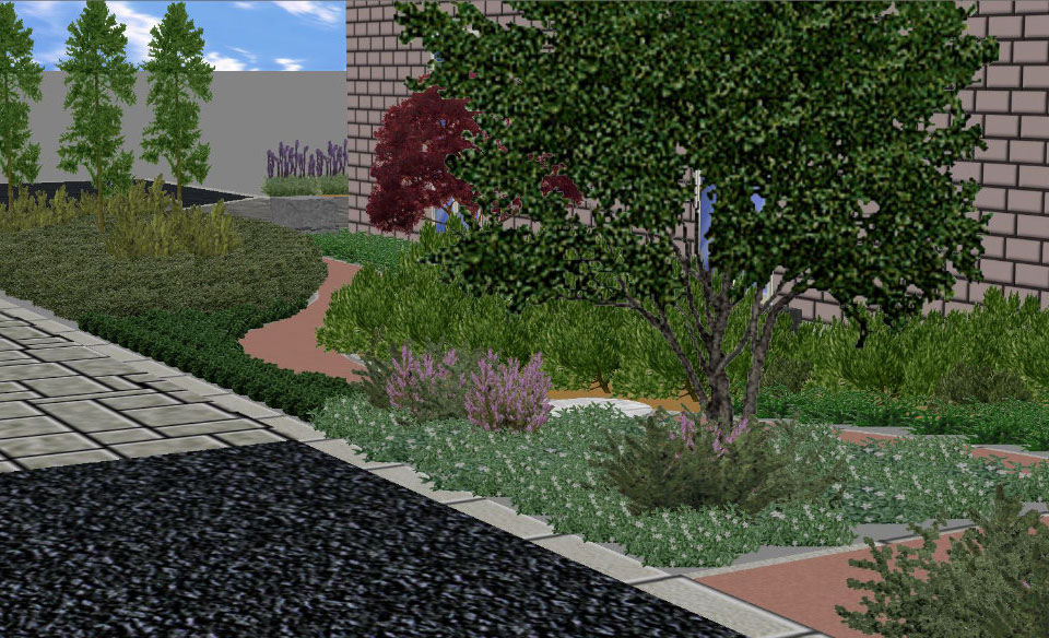 Die Ausgangssituation zeigte einen Vorgarten mit großer Rasenfläche und drei kleinen Inselbeeten. Gewünscht war eine neue Gestaltung mit Zugang zum Hauptgarten.